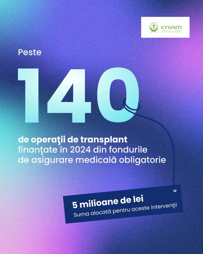 În 2024, instituțiile medicale contractate de Compania Națională de Asigurări în Medicină (CNAM) au efectuat 143 de operații de transplant, finanțate din fondurile de asigurare obligatorie de asistență medicală, cu un buget total de cinci milioane de lei.