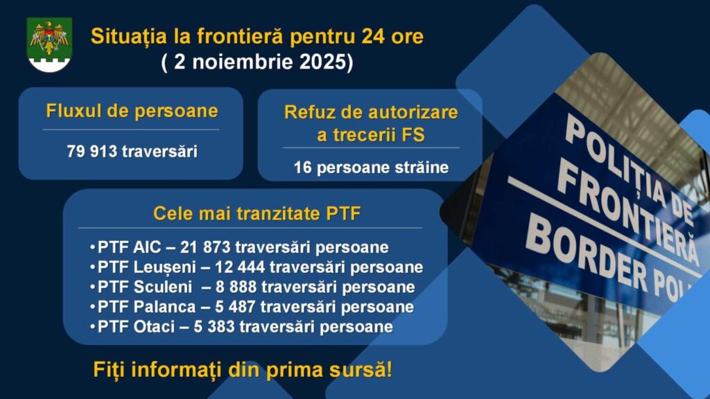 În total, prin punctele de trecere au fost înregistrate 79.913 traversări ale frontierei, iar 16 cetățeni străini au primit refuz de intrare în țară.