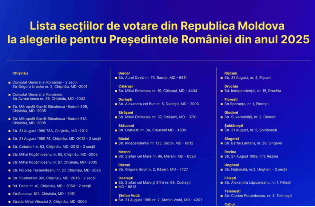 Românii stabiliți în Republica Moldova își pot exercita, începând de astăzi, 16 mai, dreptul la vot în cadrul alegerilor prezidențiale din România. Timp de trei zile, între orele 07:00 și 21:00, alegătorii pot vota în una dintre cele 64 de secții de votare deschise pe teritoriul țării.