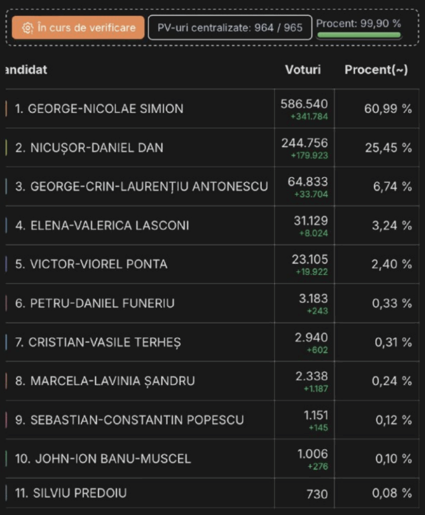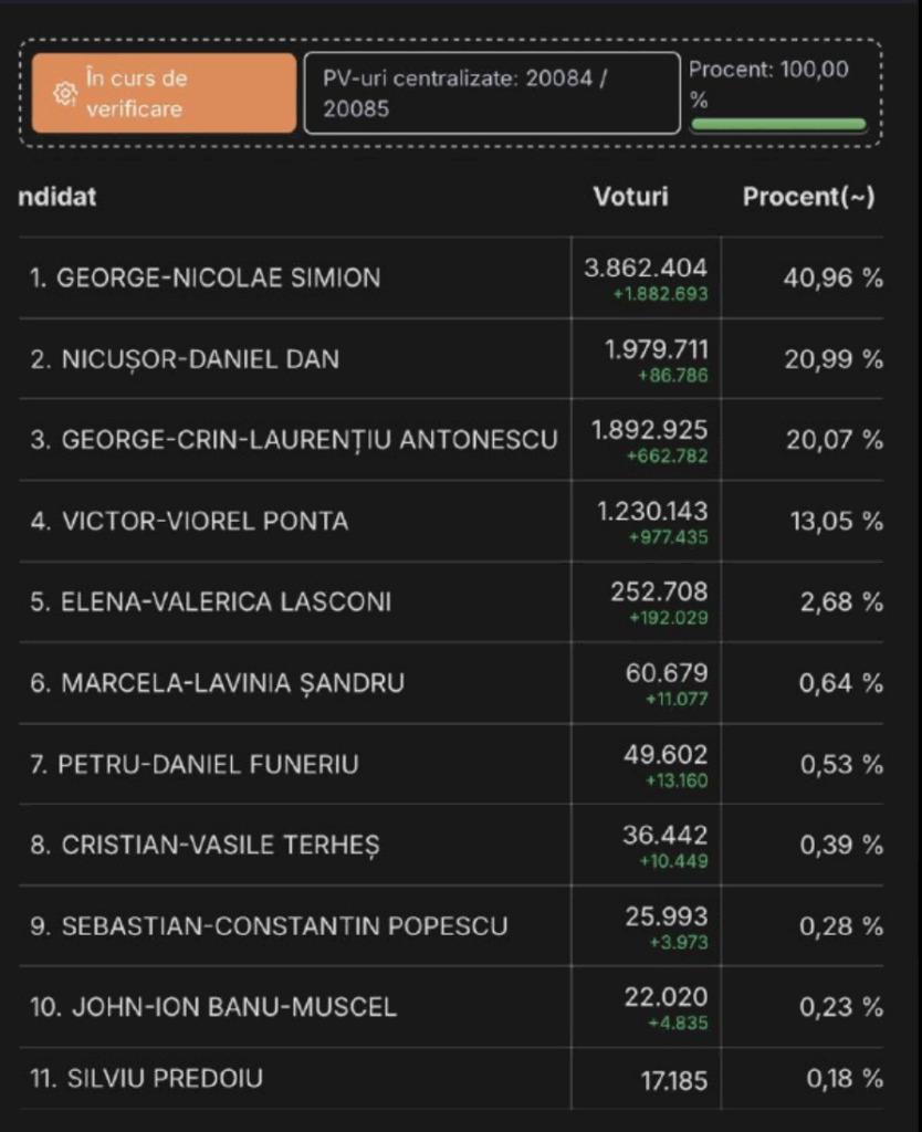 Odată cu centralizarea a 34% din voturi, clasamentul s-a modificat: Nicușor Dan a urcat pe poziția a treia, devansându-l pe Victor Ponta. După ora 00:30, a avut loc o nouă schimbare – Nicușor Dan a trecut pe locul al doilea, în fața lui Crin Antonescu. Astfel, în turul al doilea al alegerilor prezidențiale se vor confrunta George Simion și Nicușor Dan, în lupta pentru funcția supremă în stat.