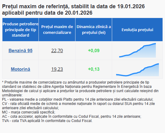 Agenția Națională pentru Reglementare în Energetică (ANRE) a afișat noile prețuri la carburanți pentru mâine, 20 ianuarie.