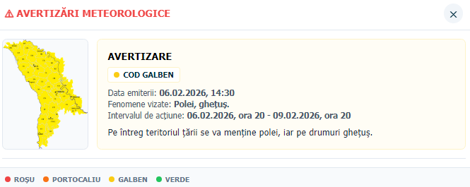 Condițiile meteorologice din Republica Moldova vor rămâne dificile și în următoarele zile. Serviciul Hidrometeorologic de Stat a prelungit Codul galben de polei și ghețuș.