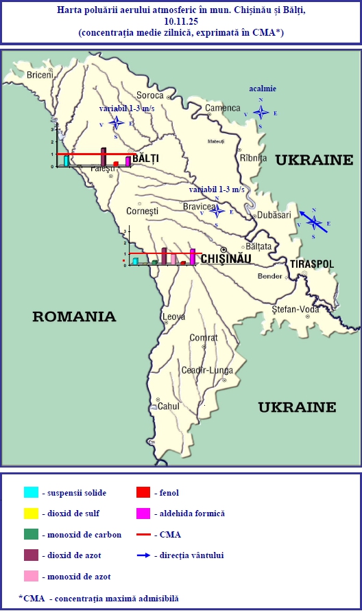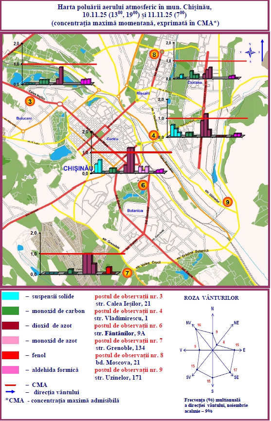 Date recente publicate de monitorizare arată că nivelele de dioxid de azot şi particule în suspensie depăşesc frecvent limitele admise în zonele concentrate în trafic intens sau în apropierea unităţilor industriale. Sectorul Centru, în special pe strada Fântânilor şi zona gării feroviare, a înregistrat cele mai mari depăşiri, iar sectoarele Botanica (pe strada Uzinelor, Vladimirescu) şi Râşcani au fost de asemenea identificate ca zone critice.