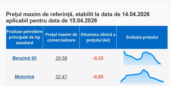 Potrivit noilor valori, benzina va costa cel mult 29,58 lei pentru un litru, cu 0,22 lei mai puțin decât în ziua precedentă.