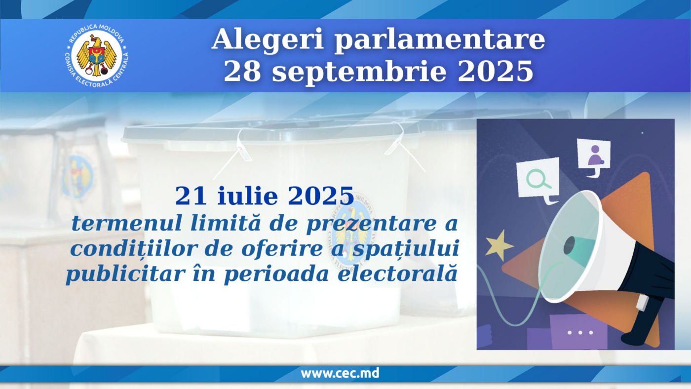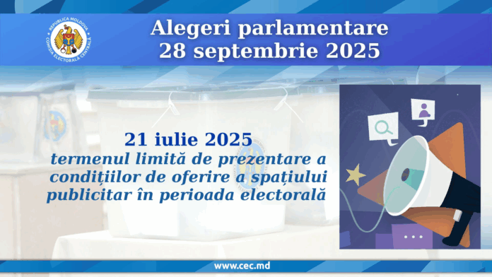 Comisia Electorală Centrală (CEC) amintește că luni, 21 iulie, este termenul-limită pentru ca furnizorii de servicii media și difuzorii de publicitate – proprietari sau administratori ai panourilor fixe ori mobile – să depună declarațiile privind condițiile de oferire a spațiului publicitar în perioada alegerilor parlamentare din 28 septembrie 2025, transmite MOLDPRES.