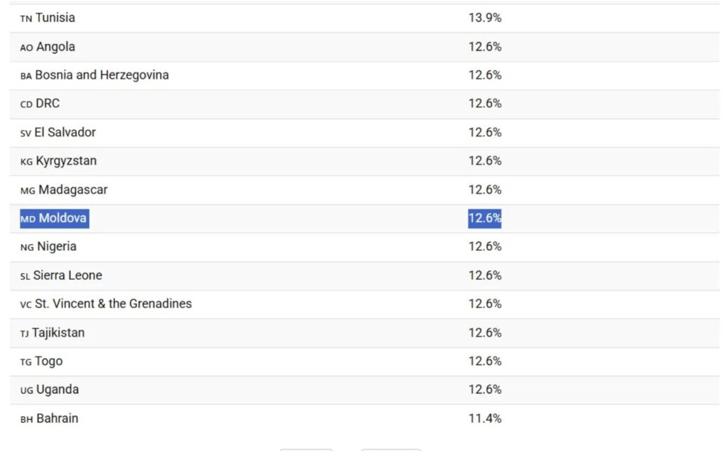 Acest nivel ridicat indică faptul că investitorii solicită randamente mai mari pentru a compensa riscurile asociate mediului economic din Republica Moldova. În clasament, țara este grupată alături de state precum Nigeria, Uganda, Tadjikistan sau Madagascar, transmite bani.md citată de știri.md și LiberNews.md.