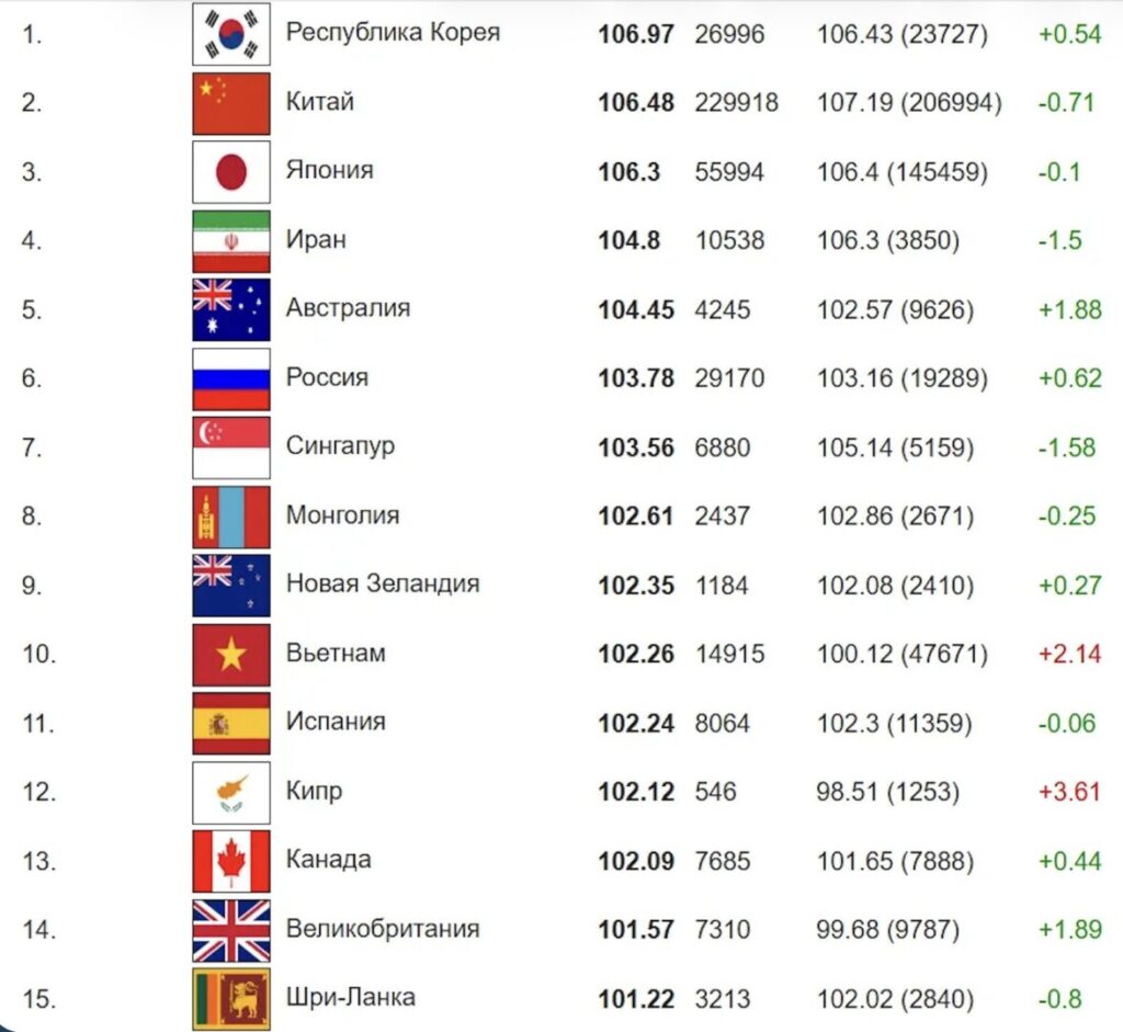 Primele cinci locuri ale clasamentului sunt ocupate de Coreea de Sud, cu un scor mediu de 106,98, urmată de China(106,48), Japonia (106,3), Iran (104,8) și Australia (104,45).