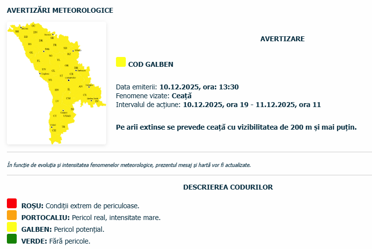 Serviciul Hidrometeorologic de Stat (SHS) a emis Cod galben de ceață astăzi , 10 decembrie și 11 decembrie, avertizarea fiind valabilă în intervalul orelor 19:00 și 11:00, pe întreg teritoriul Republicii Moldova.