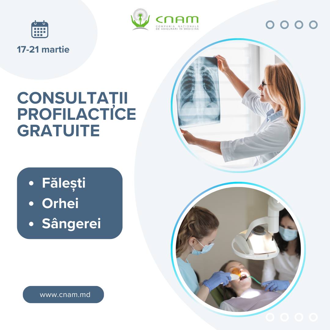 Echipe mobile de medici specialiști vor oferi consultații profilactice gratuite locuitorilor din raioanele Fălești, Orhei și Sângerei, costurile fiind acoperite din fondul măsurilor de profilaxie al Companiei Naționale de Asigurări în Medicină (CNAM).