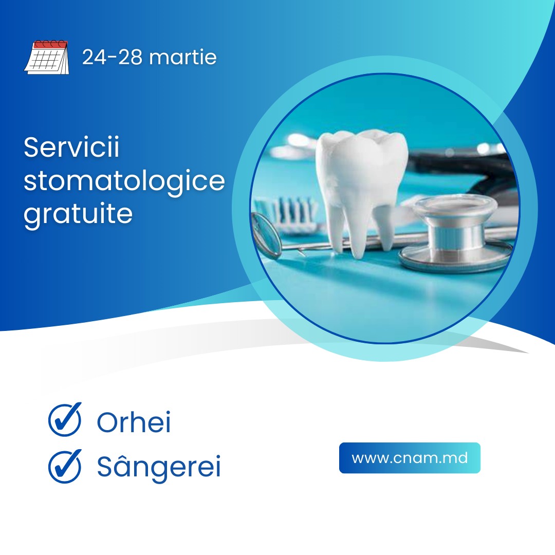 Copiii din raioanele Orhei și Sângerei vor beneficia de consultații stomatologice gratuite oferite de echipe mobile de medici specialiști. Potrivit Companiei Naționale de Asigurări în Medicină (CNAM), în această săptămână, serviciile stomatologice vor fi prestate gratuit în localitățile Peresecina (raionul Orhei) și Pepeni (raionul Sângerei).