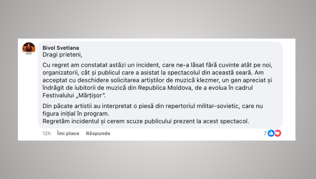 Într-un comentariu pe rețelele de socializare, directoarea instituției, Svetlana Bivol, a menționat că piesa nu fusese inițial inclusă în programul oficial al evenimentului.