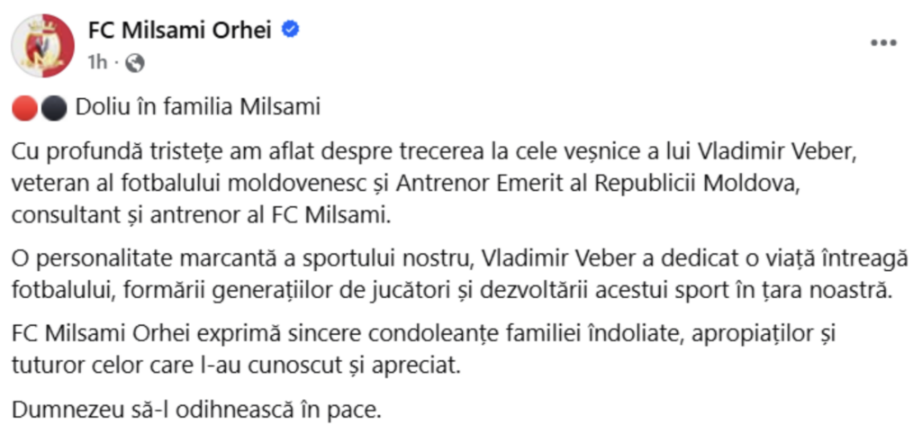 În mesajul publicat, clubul subliniază că Vladimir Veber a fost o personalitate importantă a sportului moldovenesc, dedicându-și întreaga viață fotbalului, formării tinerelor generații de jucători și dezvoltării acestui domeniu în Republica Moldova.