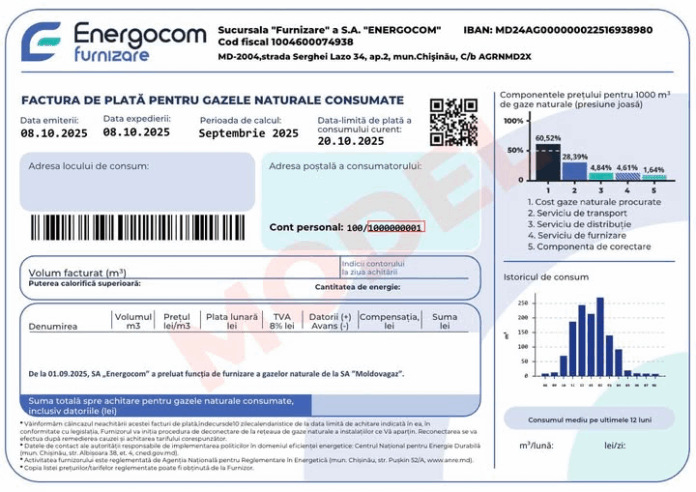 Documentele vor fi primite prin poștă sau email și au un design nou, ce include: data emiterii și termenul limită de plată, volumul de gaze consumat (m³ și kWh), istoricul de consum pe ultimele 12 luni, structura prețului pentru 1000 m³ și datele contractuale.