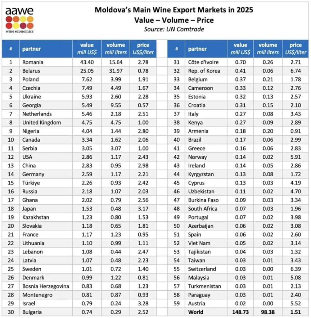 În total, în 2025, Republica Moldova a exportat vinuri în valoare de circa 149 de milioane de dolari, cu un volum de aproximativ 98 de milioane de litri și un preț mediu de 1,51 dolari pe litru.