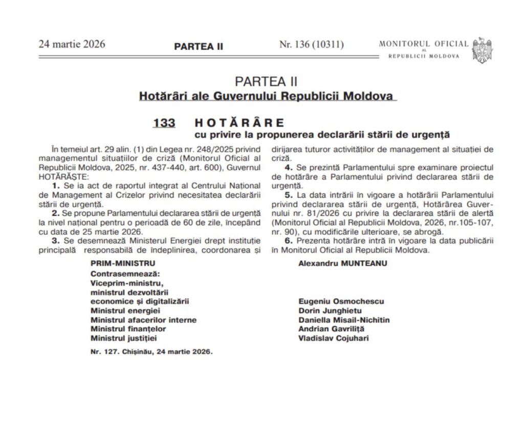 Hotărârea Guvernului prin care se propune instituirea stării de urgență în sectorul energetic pentru o perioadă de 60 de zile a fost publicată astăzi în Monitorul Oficial, informează MOLDPRES.