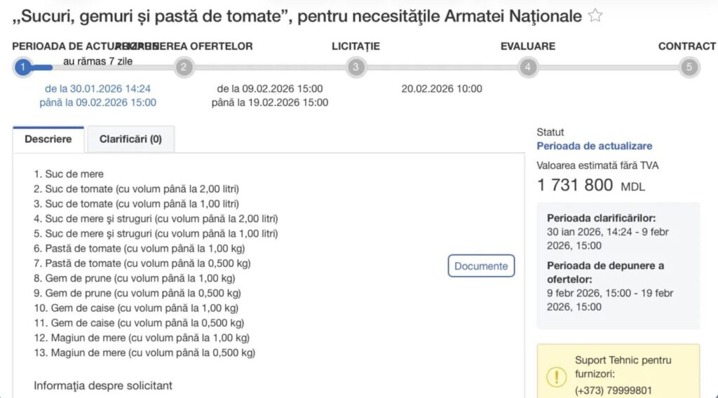 După controversele de anul trecut, când Armata Națională a fost ironizată pentru achiziția de croissante, în 2026 instituția revine cu o nouă licitație, de această dată pentru produse alimentare cu specific „dulce”. Militarii moldoveni urmează să beneficieze de sucuri, gemuri și pastă de roșii.