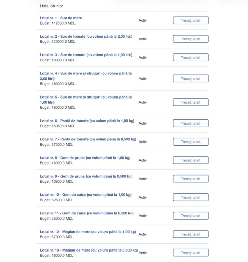 Valoarea totală a achiziției depășește 1,7 milioane de lei. Conform documentației, se intenționează procurarea sucurilor de roșii, mere, mere cu struguri, a pastei de tomate, precum și a gemului de prune, de caise și a magiunului de măr, notează realitatea.md.