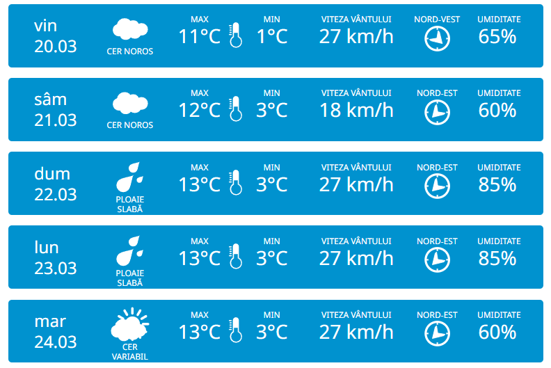 Serviciul Hidrometeorologic de Stat anunță pentru joi, 19 martie vom avea parte de cer noros și precipitații slabe în nordul țării. Vântul va moderat slab din nord-est cu 27 km/h. Potrivit meteorologilor, temperaturile vor ajunge până la +10 grade în timpul zilei, iar noaptea vor coborî până la +2 grade.