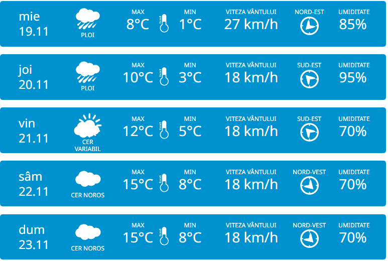 Serviciul Hidrometeorologic de Stat anunță pentru marți, 18 noiembrie vom avea parte de cer noros și precipitații în partea de centru și sud a Republicii Moldova. Pe întreg teritoriul țării va fi vânt moderat din nord-vest cu 37 km/h. Potrivit meteorologilor, temperaturile vor ajunge până la +14 grade în timpul zilei, iar noaptea vor coborî până la +10 grade.