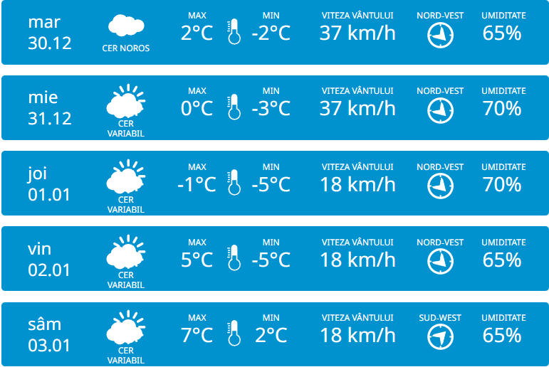 Serviciul Hidrometeorologic de Stat anunță pentru luni, 29 decembrie vom avea parte de cer noros și precipitații slabe pe întreg teritoriul Republicii Moldova. Vântul va sufla puternic din nord-vest cu 46 km/h. Potrivit meteorologilor, temperaturile vor ajunge până la +2 grade în timpul zilei, iar noaptea vor coborî până la -4 grade.