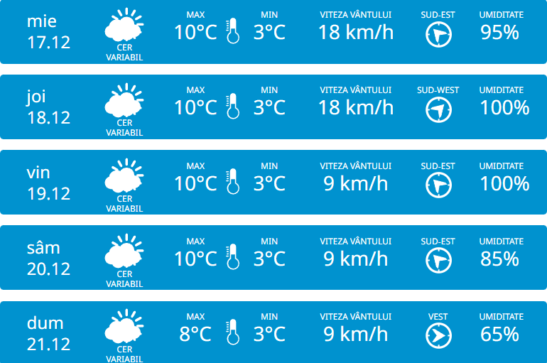 Serviciul Hidrometeorologic de Stat anunță pentru vineri, 16 decembrie vom avea parte de cer în mare parte, senin pe întreg teritoriul Republicii Moldova. Vântul va sufla moderat din nord-vest cu 3 km/h. Potrivit meteorologilor, temperaturile vor ajunge până la +8 grade în timpul zilei, iar noaptea vor coborî până la +1 grade.