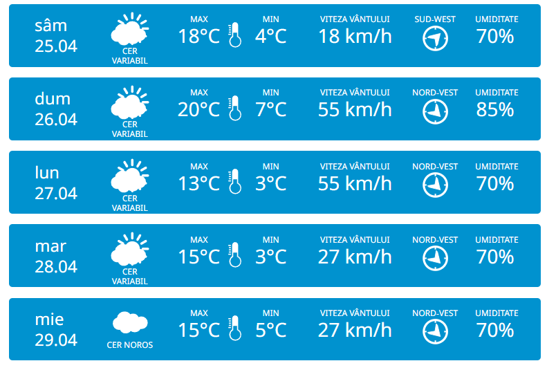 Serviciul Hidrometeorologic de Stat anunță pentru vineri, 24 aprilie vom avea parte de cer variabil și fără precipitații esențiale pe întreg teritoriul țării. Vântul va sufla moderat din nord-vest cu 37 km/h. Potrivit meteorologilor, temperaturile vor ajunge până la +16 grade în timpul zilei, iar noaptea vor coborî până la +4 grade.