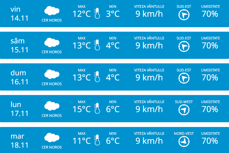 Serviciul Hidrometeorologic de Stat anunță pentru joi, 13 noiembrie vom avea parte de cer variabil și fără precipitații. Pe întreg teritoriul țării va fi vânt slab din nord-vest cu 3 km/h. Potrivit meteorologilor, temperaturile vor ajunge până la +12 grade în timpul zilei, iar noaptea vor coborî până la +7 grade.