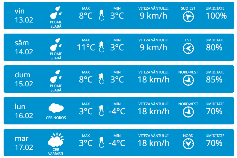 Serviciul Hidrometeorologic de Stat anunță pentru joi, 12 februarie vom avea parte de cer variabil și fără precipitații esențiale pe tot teritoriul Republicii Moldova. Vântul va sufla moderat din sud-est cu 18 km/h. Potrivit meteorologilor, temperaturile vor ajunge până la +7 grade în timpul zilei, iar noaptea vor coborî până la +3 grade.