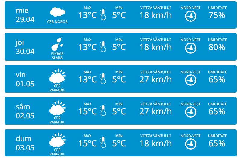 Serviciul Hidrometeorologic de Stat anunță pentru marți, 28 aprilie vom avea parte de cer senin și fără precipitații pe întreg teritoriul țării. Vântul va sufla moderat din nord-vest cu 18 km/h. Potrivit meteorologilor, temperaturile vor ajunge până la +16 grade în timpul zilei, iar noaptea vor coborî până la +4 grade.