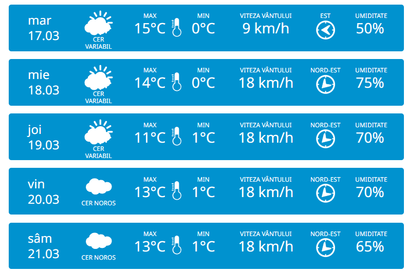 Serviciul Hidrometeorologic de Stat anunță pentru luni, 16 martie vom avea parte de cer variabil pe tot teritoriul Republicii Moldova. Vântul va sufla slab din est cu 9 km/h. Potrivit meteorologilor, temperaturile vor ajunge până la +14 grade în timpul zilei, iar noaptea vor coborî până la +1 grade.