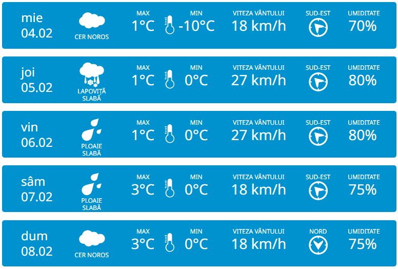 Serviciul Hidrometeorologic de Stat anunță pentru marți, 3 februarie vom avea parte de cer variabil și fără precipitații pe tot teritoriul Republicii Moldova. Vântul va sufla moderat din sud-est cu 3 km/h. Potrivit meteorologilor, temperaturile vor ajunge până la -5 grade în timpul zilei, iar noaptea vor coborî până la -10 grade.