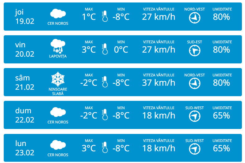 Serviciul Hidrometeorologic de Stat anunță pentru miercuri, 18 februarie vom avea parte de cer noros și precipitații sub formă de lapoviță și ninsoare pe tot teritoriul Republicii Moldova. Vântul va sufla puternic din nord-vest cu 55 km/h. Potrivit meteorologilor, temperaturile vor ajunge până la -2 grade în timpul zilei, iar noaptea vor coborî până la -7 grade.