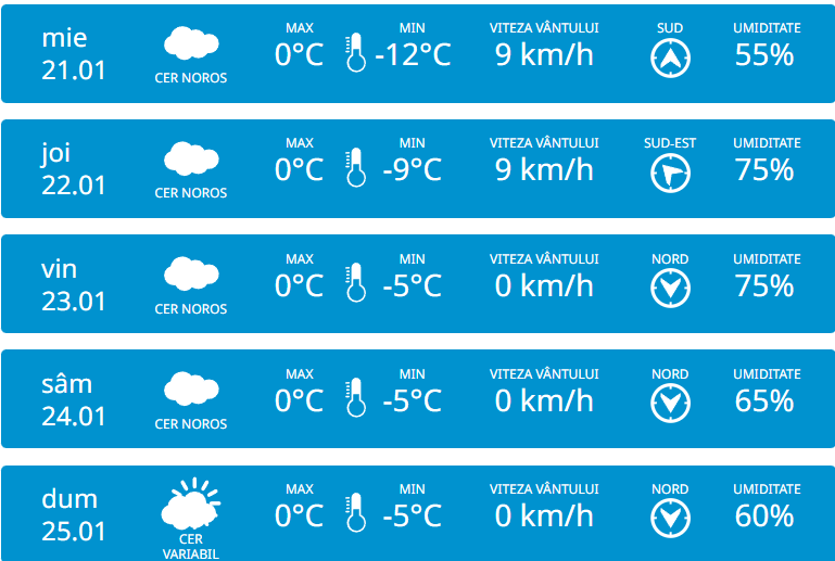 Serviciul Hidrometeorologic de Stat anunță pentru marți, 20 ianuarie vom avea parte de cer variabil și fără precipitații pe tot parcursul zilei. Vântul va sufla slab din nord-est cu 3 km/h. Potrivit meteorologilor, temperaturile vor ajunge până la -5 grade în timpul zilei, iar noaptea vor coborî până la -15 grade.