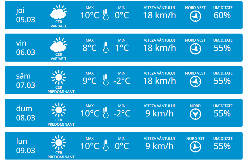 Serviciul Hidrometeorologic de Stat anunță pentru miercuri, 4 martie vom avea parte de cer senin pe tot teritoriul Republicii Moldova. Vântul va sufla slab din vest cu 9 km/h. Potrivit meteorologilor, temperaturile vor ajunge până la +10 grade în timpul zilei, iar noaptea vor coborî până la 0 grade.