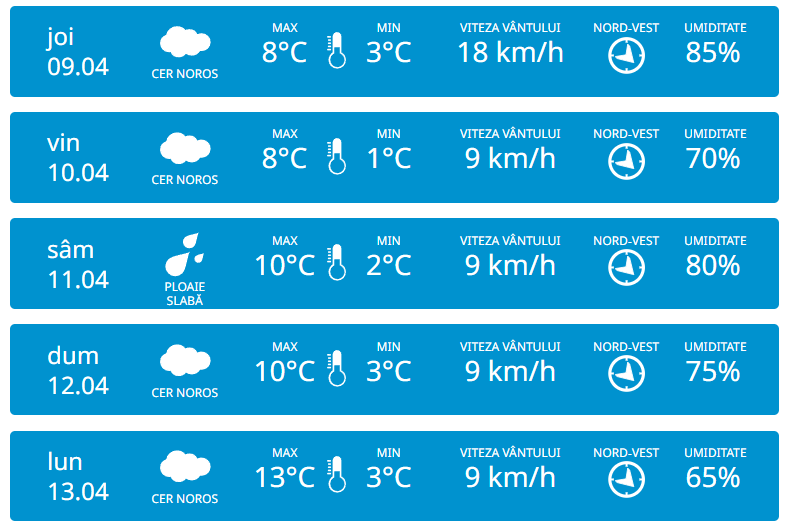 Serviciul Hidrometeorologic de Stat anunță pentru miercuri, 8 aprilie vom avea parte de cer noros și precipitații slabe în regiunea de nord a țării. Vântul va sufla puternic din nord-vest cu 46 km/h. Potrivit meteorologilor, temperaturile vor ajunge până la +9 grade în timpul zilei, iar noaptea vor coborî până la +3 grade.