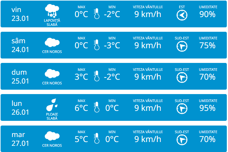 Serviciul Hidrometeorologic de Stat anunță pentru joi, 22 ianuarie vom avea parte de cer noros și precipitații sub formă de lapoviță pe întreg teritoriul Republicii Moldova. Vântul va sufla slab din sud-est cu 18 km/h. Potrivit meteorologilor, temperaturile vor ajunge până la -5 grade în timpul zilei, iar noaptea vor coborî până la -15 grade.