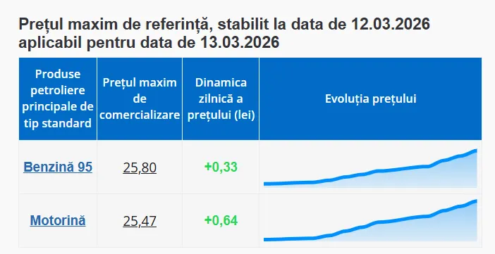 Prețul carburanților continuă să crească în a doua săptămână a războiului din Orientul Mijlociu. Agenția Națională pentru Reglementare în Energetică (ANRE) anunță tarifele pentru ziua de vineri, 13 martie 2026. Astfel, benzina se va scumpi cu 33 de bani, iar motorina cu 64 de bani.