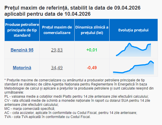 În aceste condiții, pentru data de 10 aprilie 2026, ANRE a stabilit următoarele prețuri maximale de comercializare cu amănuntul: 29,83 lei/litru pentru benzina COR 95, în creștere cu 1 ban și 34,49 lei/litru pentru motorina standard, în scădere cu 49 de bani.
