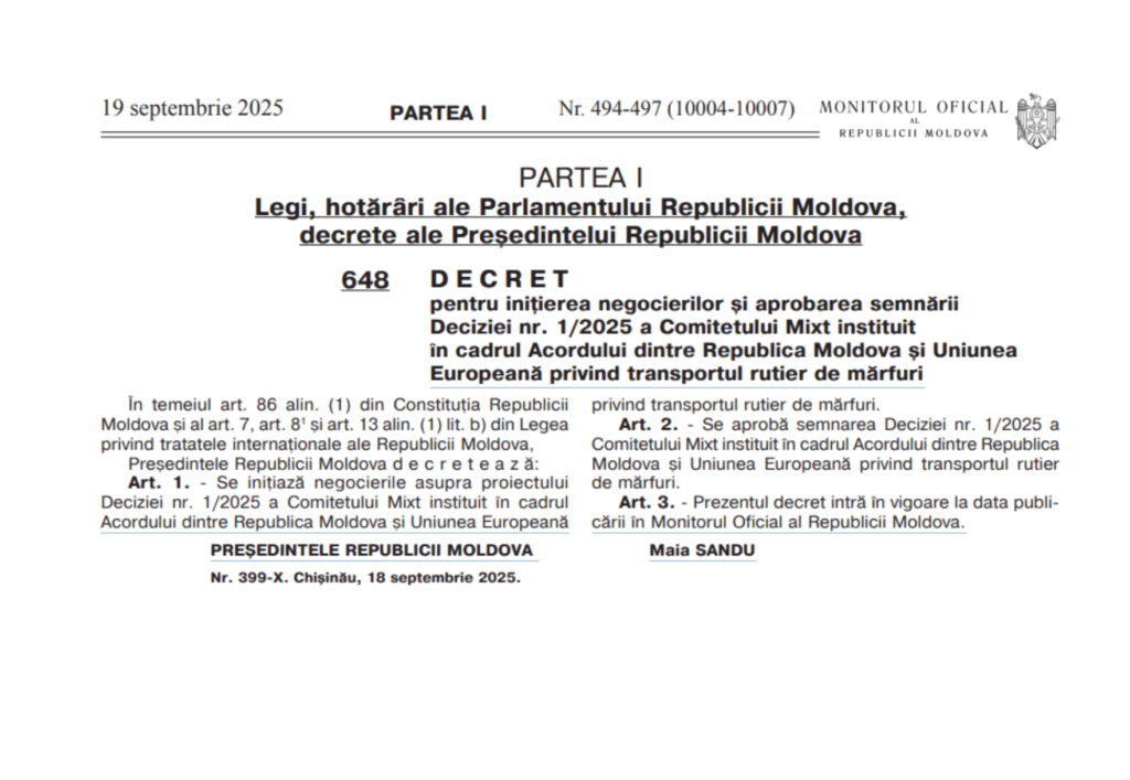 Republica Moldova a deschis negocierile cu Uniunea Europeană pentru consolidarea cooperării în transportul rutier de mărfuri, după publicarea în Monitorul Oficial a decretului semnat de președinta Maia Sandu, transmite MOLDPRES. Documentul prevede inițierea discuțiilor asupra proiectului Deciziei nr. 1/2025, aprobarea semnării acesteia în Comitetul Mixt moldo-european și aplicarea imediată a prevederilor.