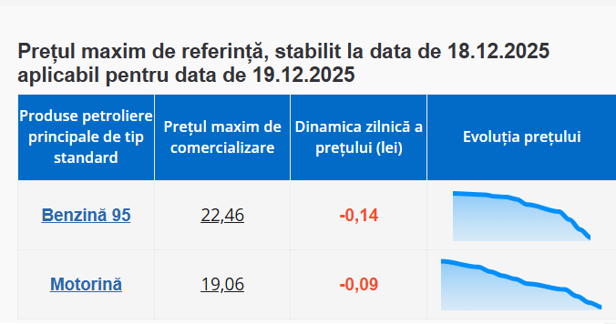 Așadar, litrul de benzină va costa 22,46 lei, iar cel de motorină 19,06 lei.