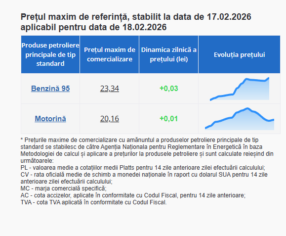 Agenția Națională pentru Reglementare în Energetică (ANRE) a publicat marți, 17 februarie, noi prețuri maxime la produsele petroliere principale de tip standard, care vor fi valabile începînd cu 18 februarie.
