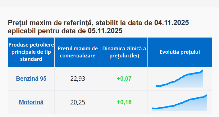 Reamintim că și pentru ziua de marți, 4 noiembrie, ANRE a stabilit o creștere semnificativă la motorină. Astfel, un litru de benzină A95 este comercializat cu 22 de lei și 86 de bani, cu 5 bani mai mult, iar motorina la un preț de 20 lei și 09 de bani, cu 17 bani mai mult.