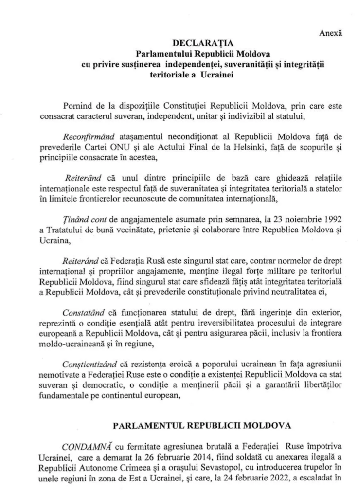 Declarația adoptată este un gest simbolic de sprijin necondiționat pentru Ucraina și reflectă angajamentul Republicii Moldova față de valorile europene, pace și libertate.