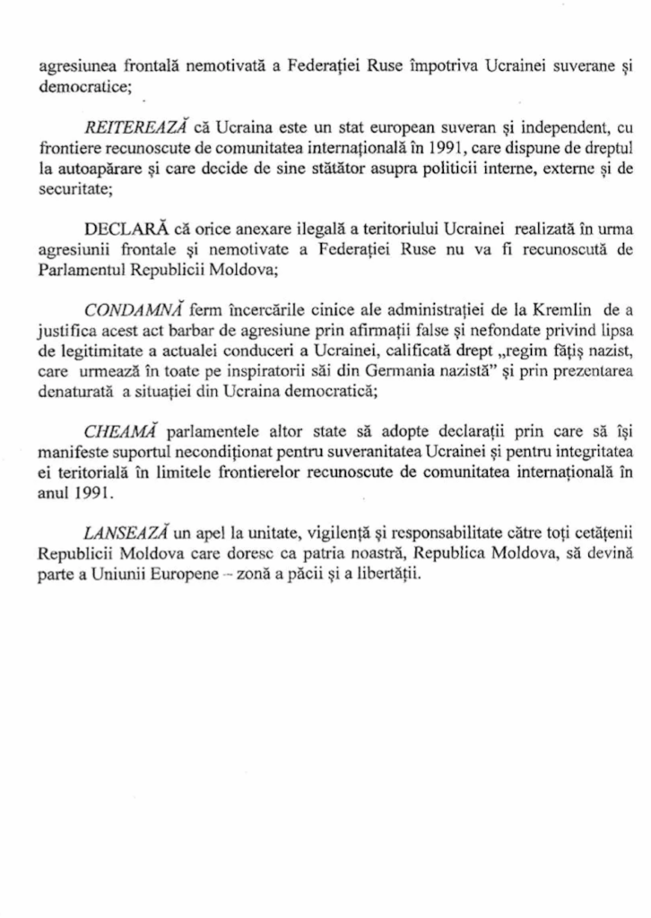 - Apel către parlamentele lumii pentru susținerea suveranității Ucrainei și îndemn adresat cetățenilor Moldovei la unitate și vigilență.