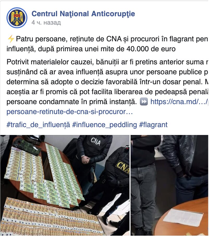 Patru persoane au fost surprinse în flagrant în timp ce primeau 40.000 de euro, într-o operațiune desfășurată de ofițerii Centrului Național Anticorupție, în colaborare cu procurorii municipiului Chișinău. Acțiunea a avut loc în sectorul Rîșcani al capitalei, imediat după transmiterea sumei de bani, monitorizată de anchetatori.