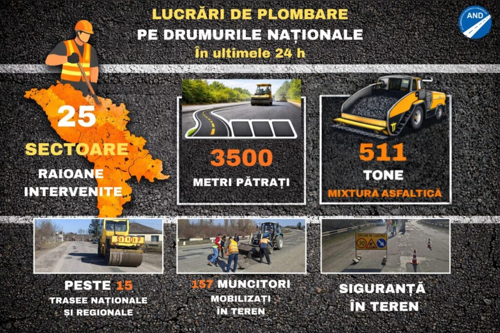 . Echipele din cadrul întreprinderilor teritoriale S.A. „Drumuri” au utilizat o cantitate totală de 511 tone de mixtură asfaltică pentru lucrări de plombare a gropilor apărute pe partea carosabilă.