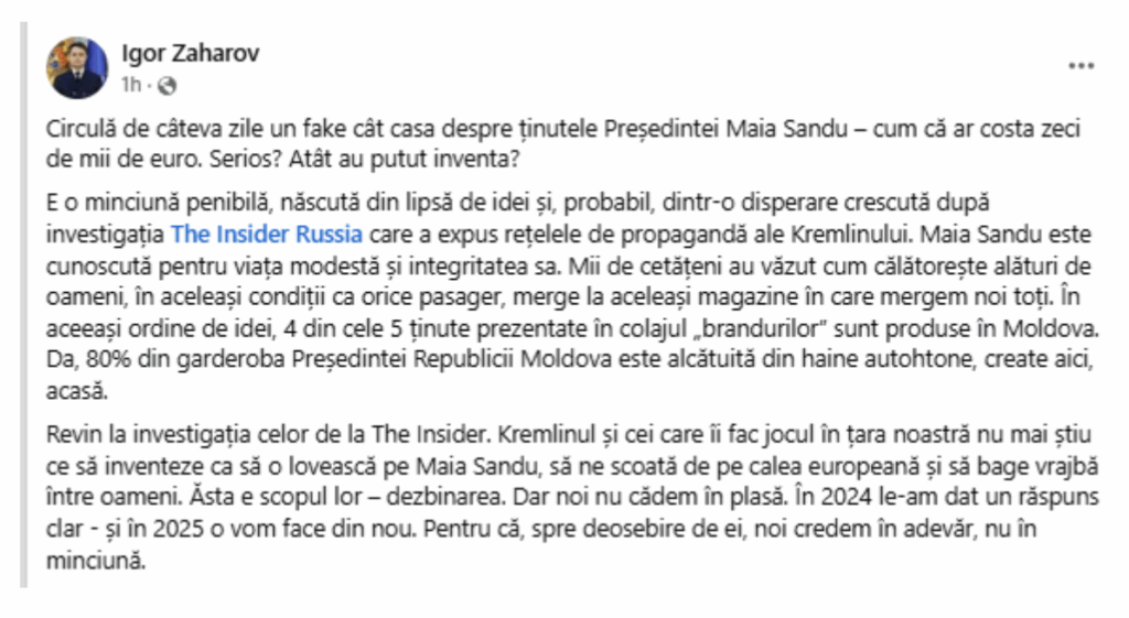 Purtătorul de cuvânt al Președinției, Igor Zaharov, a reacționat la o serie de informații false care circulă în spațiul public, referitoare la ținutele Maiei Sandu. Acesta susține că, de câteva zile, este promovat „un fake cât casa”, potrivit căruia hainele președintei ar costa zeci de mii de euro.