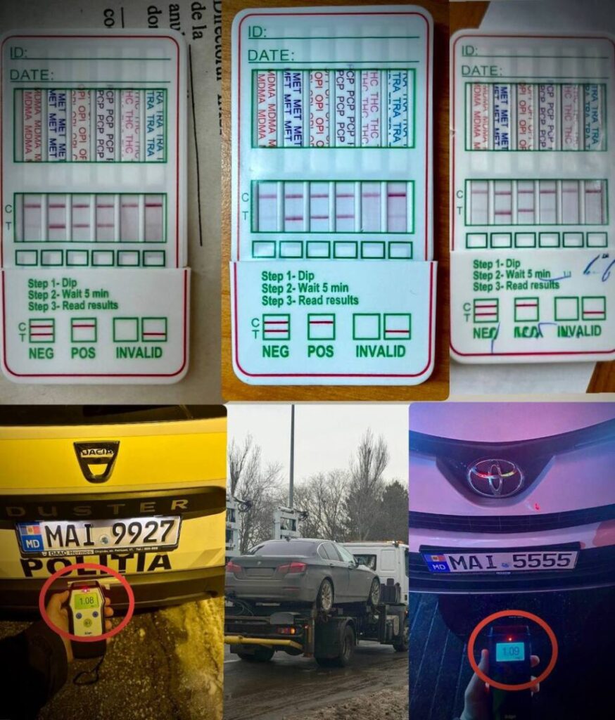 Au fost înregistrate și cazuri de conducere în stare de ebrietate. În comuna Budești, un bărbat de 37 de ani avea o concentrație de 1,08 mg/l alcool în aerul expirat. Pe bulevardul Mircea cel Bătrân din Chișinău, un șofer de 39 de ani a fost depistat cu 1,09 mg/l alcool în aerul expirat.