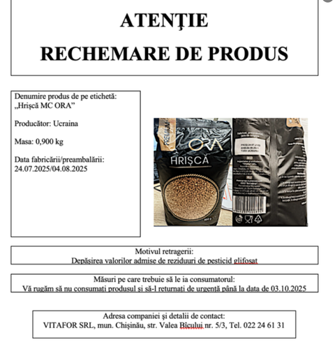 Agenția Națională pentru Siguranța Alimentelor (ANSA) a anunțat retragerea unui lot de hrișcă de pe piață.