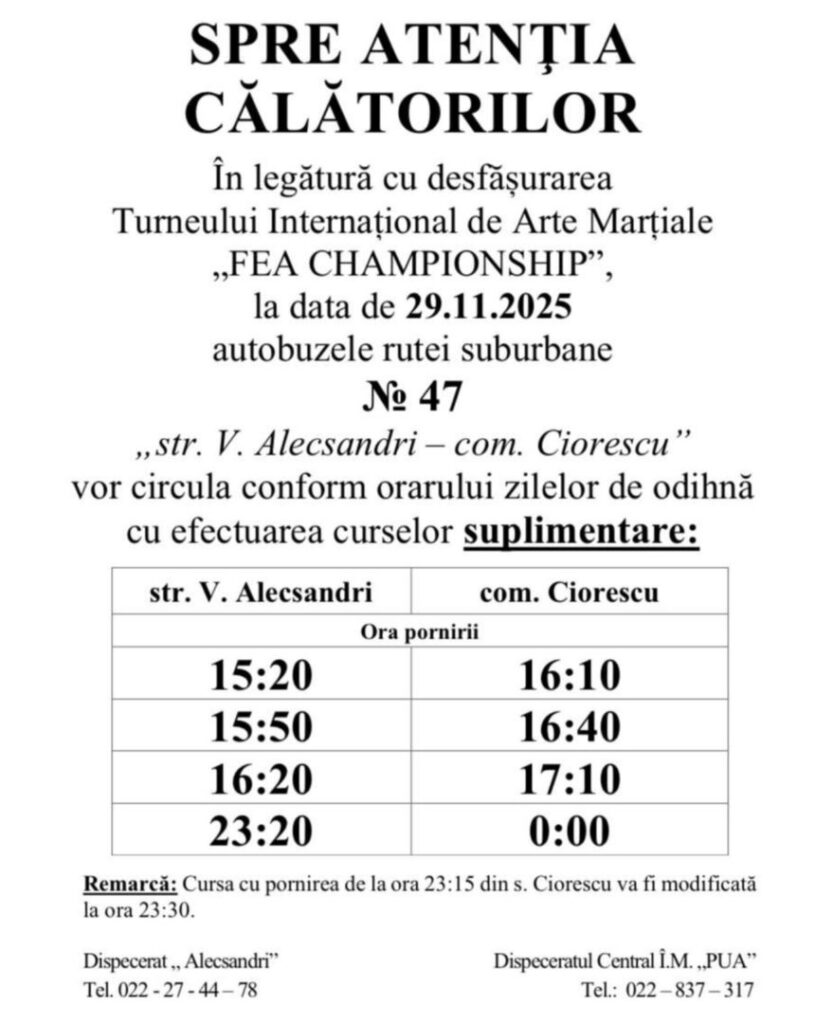 Primăria municipiului Chișinău anunță modificare în circulația transportului public, informează. În data de 29 noiembrie 2025, odată cu desfășurarea Turneului Internațional de Arte Marțiale, autobuzele rutei suburbane nr. 47 „str. V. Alecsandri – com. Ciorescu” vor opera conform orarului stabilit pentru zilele de odihnă.